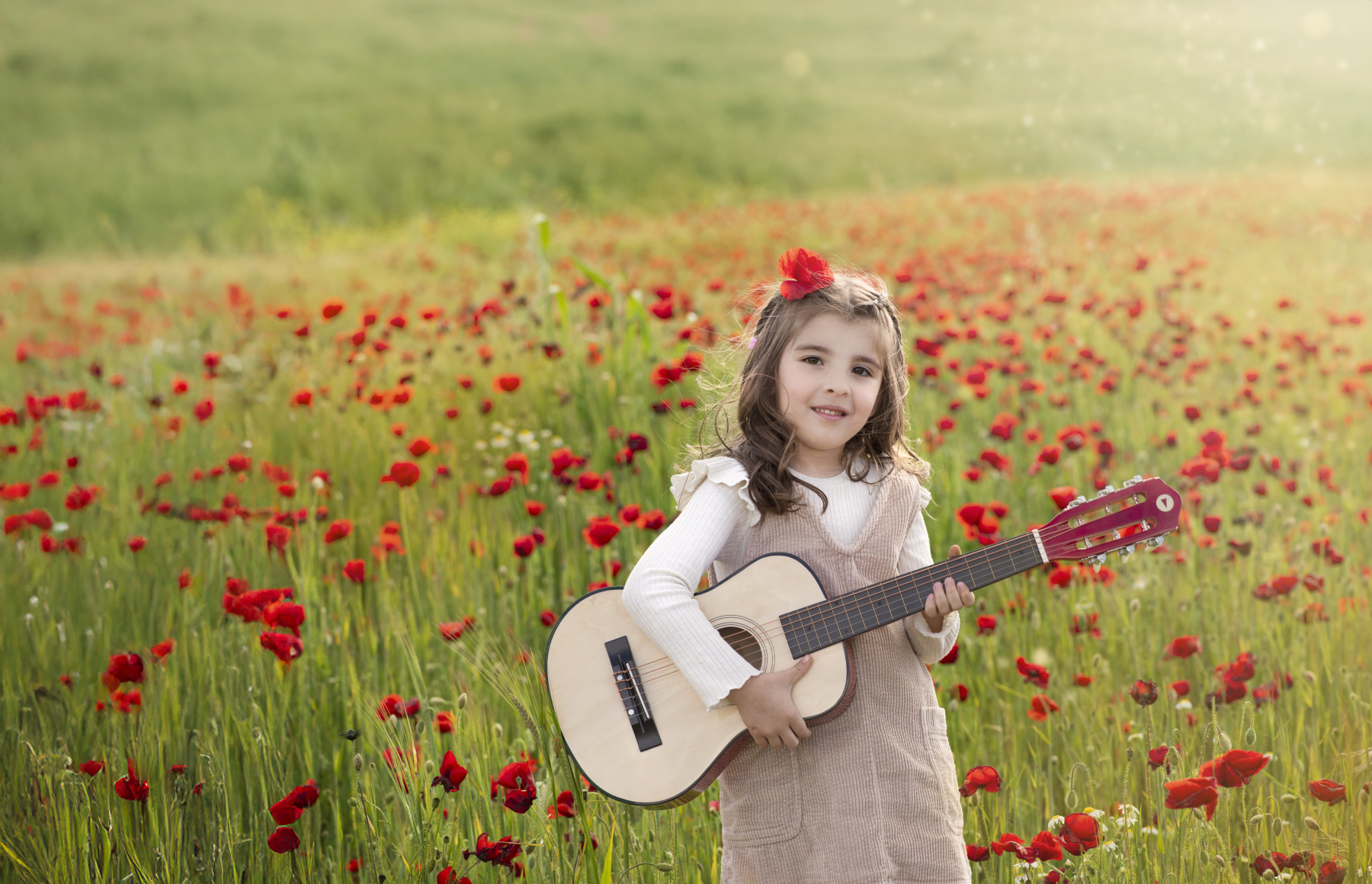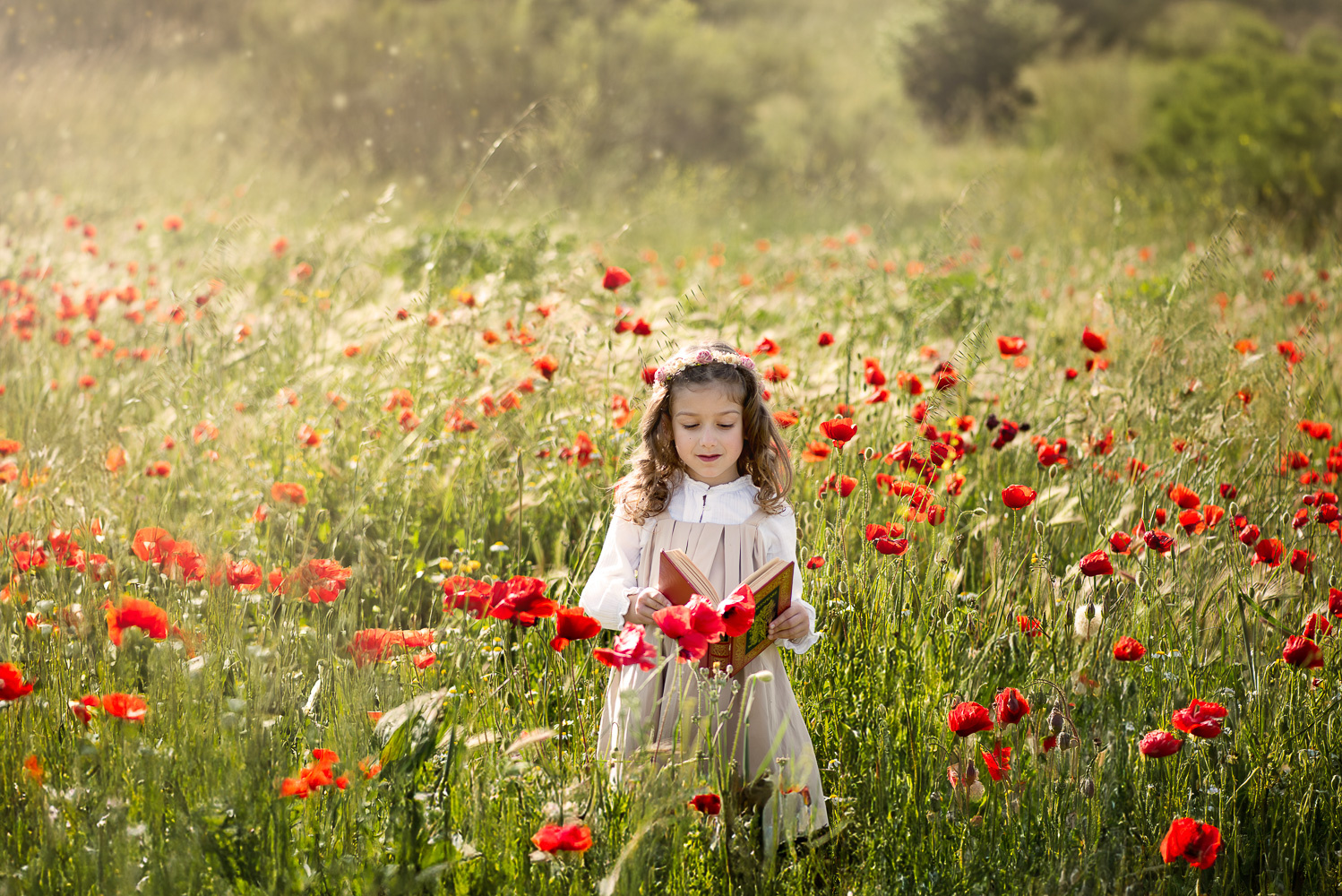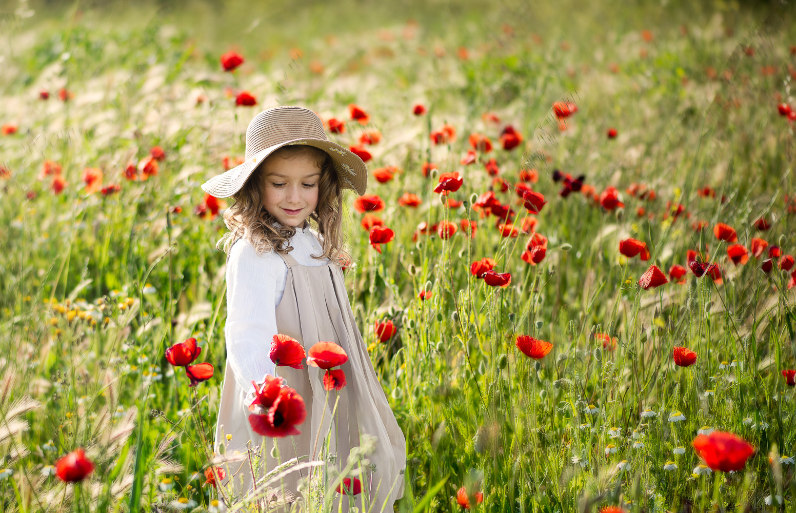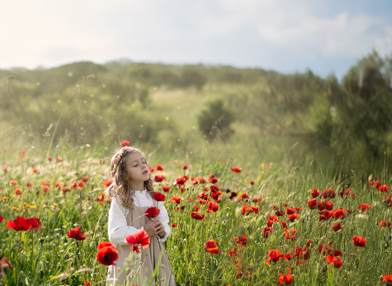 El rojo de las amapolas, la luz suave y la naturalidad del momento crean recuerdos llenos de magia.